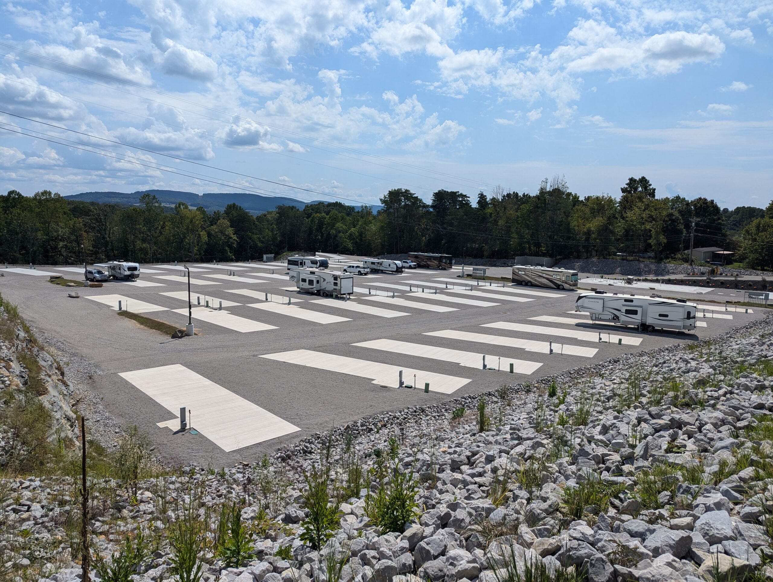 - Concrete RV pads with 30/50 amp hookups, water, and sewer